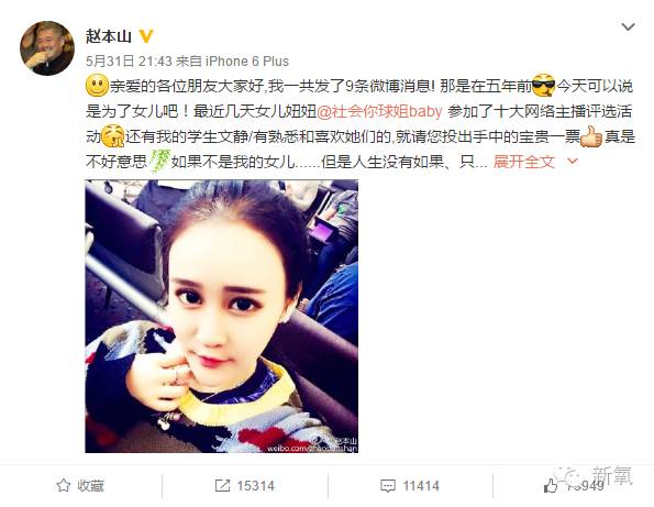5月31日,赵本山更博,敲了一大段字为亲闺女拉票。