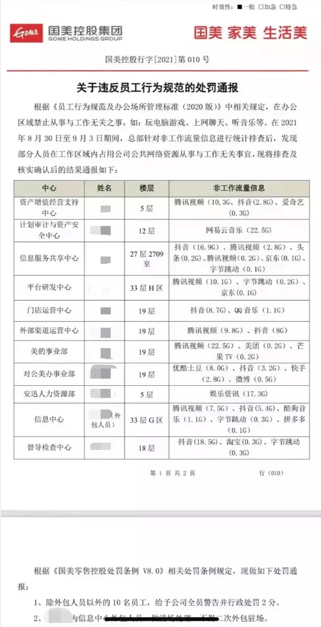 近日,一张国美集团《关于违反员工行为规范的处罚通报》的截图在网络上流传,图片上提到,公司发现部分人员在工作区域内,“占用公司公共网络资源从事与工作无关的事宜”。表格中涉及11人,常打开的APP里有腾讯视频、抖音、爱奇艺、网易云音乐等。