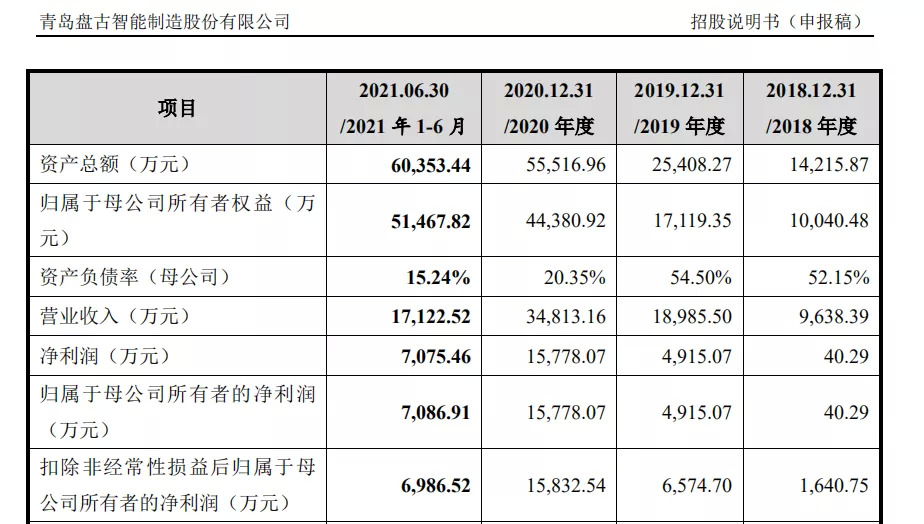 2018年至2021年上半年,盘古智能营业收入分别实现9638.39万元、1.90亿元、3.48亿元及1.71亿元,三年间复合增长率高达90.05%;归母净利润分别实现40.29万元、4915.07万元、1.58亿元及7086.91万元,同样涨幅惊人。