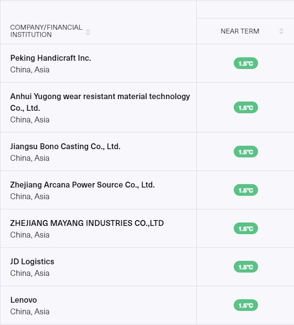 在中国大陆,有11家公司设立的科学碳目标已经得到了SBTi的验证,这其中有4家公司设定了WB2目标(Well Below 2℃),有7家公司设定了1.5℃目标,包括联想和京东物流。