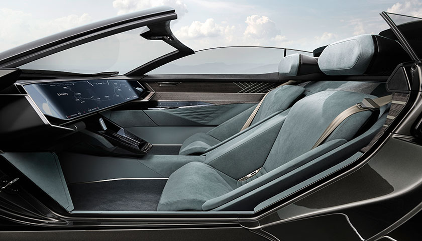 奥迪skysphere概念车内饰设计受到了Art Deco装饰艺术的启发。车内空间以轻松、宽敞私密环境为基调。搭载的1415×180mm触屏中控台,与车门操作面板形成全环绕数字化视觉空间。