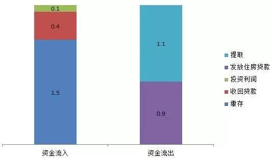 从全国范围来看,2015年的缴存额约1.5万亿元,仍然大于全年提取额,但当年发放贷款与提取额之和约2万亿元,超过当年缴存额约40%。截至2015年末,全国公积金累计缴存余额约4万亿元。2015年度,资金流出为发放住房消费贷款和提取共约2万亿元,资金流入包括全年缴存额约1.5万亿元、利润0.1万亿元、收回贷款0.4万亿元。资金净流出基本约等于资金净流入。