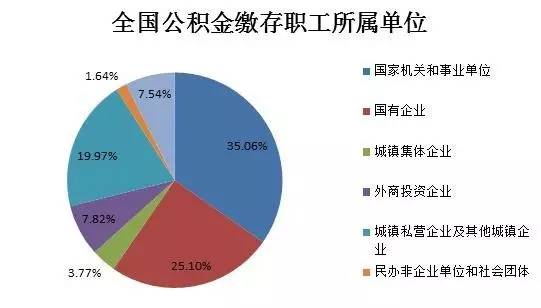 缴存职工中,国家机关和事业单位占35.06%,国有企业站25.1%,城镇集体企业占3.77%,外商投资企业占7.82%,城镇私营企业及其他城镇企业占19.97%,民办非企业单位和社会团体占1.64%,其他占7.54%。