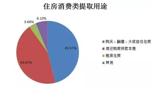 在住房消费类提取中,购买、翻建、大修自住住房占比45.57%,偿还购房贷款本息占比43.67%,租赁住房占比3.66%,其他占比6.1%。