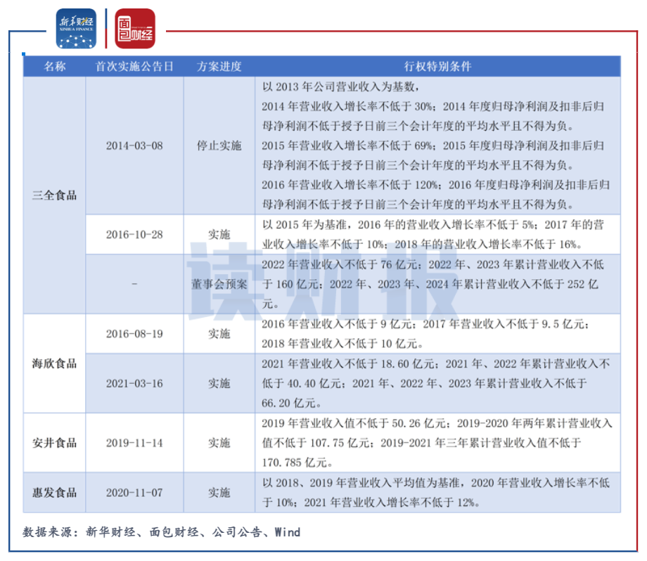 翻阅资料发现,速冻食品企业的股权激励方案多以营收指标为考核目标。其中,三全食品曾在2014年发布的股权激励方案涉及利润指标,但因营收及利润指标均未达标,未能成功实施。