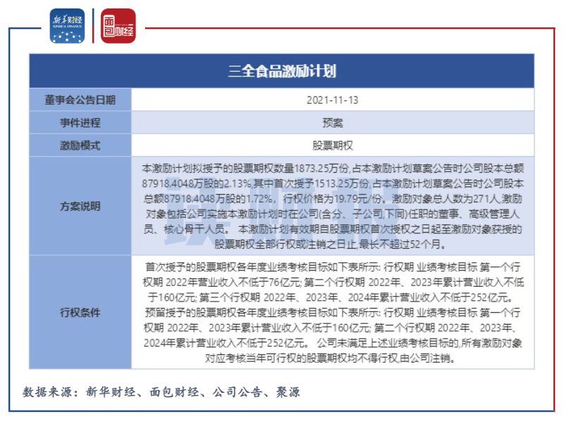 三全食品近期披露2021年股权激励计划草案,拟向271人授予股票期权1873.25万份,其中首次授予管理层部分为155.4万份,占本次股票期权激励总数的8.29%。业绩考核方面,公司以2022年-2024年的营业收入作为考核指标,未将利润指标纳入考核范围。
