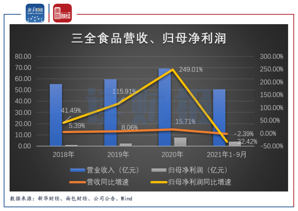 图4:2018年至2021年前三季度三全食品营收、归母净利润