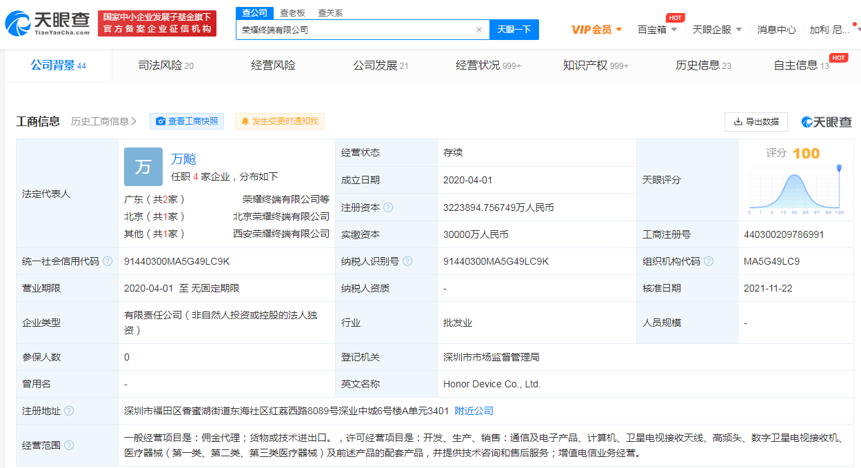 据天眼查App显示,近日,荣耀终端有限公司发生工商变更,企业注册资本由约315.4亿人民币增至约322.4亿人民币。该公司成立于2020年4月,法定代表人万飚,由深圳市智信新信息技术有限公司全资持股。