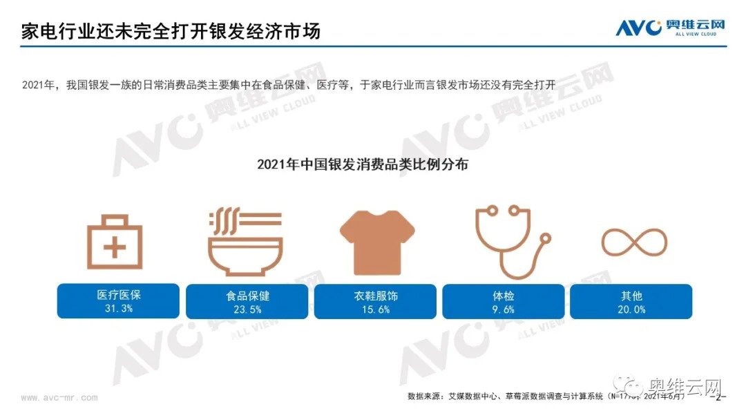 当前我国正处于轻度老龄化社会时期,根据历年出生人口数判断,未来我国将进入老龄化加速期,银发一族群体规模持续扩增,所以银发经济无疑是一片新蓝海。2021年银发一族的日常消费品类主要集中在食品保健、医疗等。于家电行业而言银发市场还没有完全打开。
