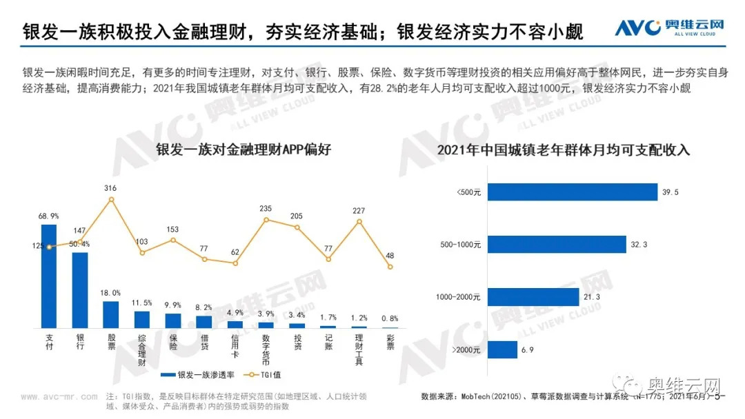 近年来,银发一族对于养老有自己的态度,他们不选择被动养老,而是积极投入理财,进一步夯实自身经济基础,提高消费能力;除存款外,2021年我国城镇老年群体月均可支配收入,有28.2%的老年人月均仍有1000元及以上的可支配空间,银发经济实力不容小觑。