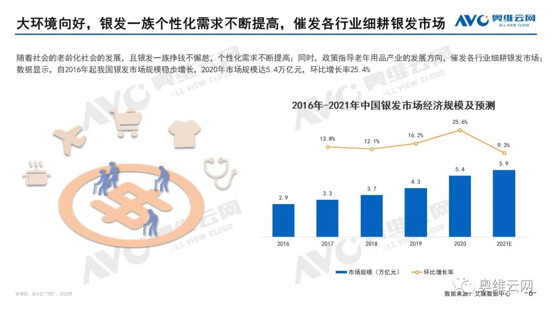 随着生活水平的不断提高,银发一族对于生活品质,有了更多需求,个性化需求不断提高;再加上政策指导适老产业发展,促使银发经济市场稳步发展,数据显示,至2020年,银发市场规模达5.4万亿元,环比增长率25.4%。