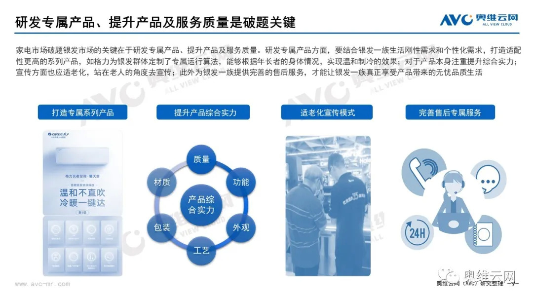 家电市场破题“银发市场”的关键在于研发专属产品、提升产品及服务质量。研发专属产品方面,要结合银发一族生活刚性需求和个性化需求,打造适配性更高的系列产品;注重提升产品综合实力;宣传方面也应适老化;此外为银发一族提供完善的售后服务;通过源头把控产品、过程适老宣传、末端完善售后,才能真正让银发一族享受产品带来的无忧品质生活。