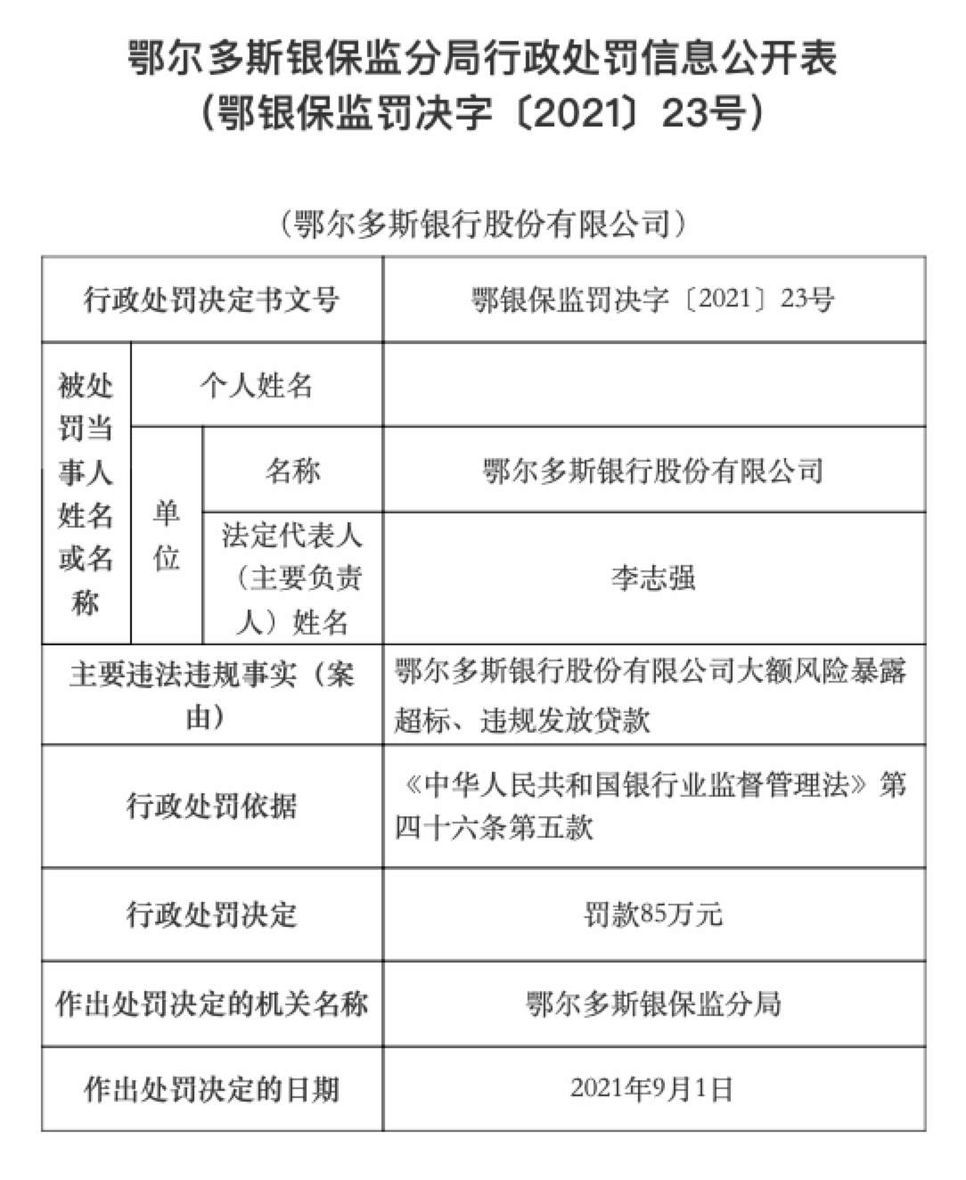 大额风险暴露超标、违规发放贷款,鄂尔多斯银行被罚85万元