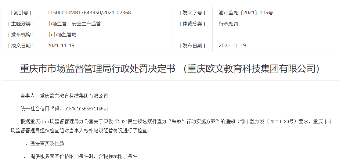 近日,重庆市市场监督管理局发布了一则行政处罚决定书,决定书显示,重庆欧文教育科技集团有限公司因提供服务带有价格附加条件时,含糊标示附加条件的行为给予警告,并处罚款2万元;实施虚假或引人误解的商业宣传的行为给予罚款35万元,两项罚款共计55万元。