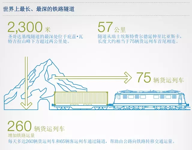 士圣哥达基线隧道从瑞士埃斯特费尔德延伸至比亚斯卡,是阿尔卑斯新铁路干线(AlpTransit)的重要组成部分。若一辆汽车以平均60公里/小时的速度行驶,完全开出隧道需要将近一小时。