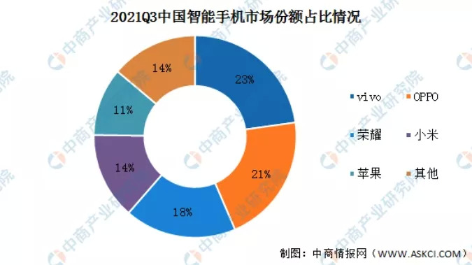 据Canalys数据显示,2021中国大陆第三季度智能手机出货量前6的品牌中,vivo出货量最多,达18.3百万台,占市场份额23%。荣耀手机增长明显,从今年第二季度的9%市占率到第三季度的18%,占领了目前第三的位置。作为曾经的华为子品牌,荣耀在线下承接了华为的销售渠道资源,因而市场拓展效率很高,排位第三。而小米和苹果分别位列第四、五位。
