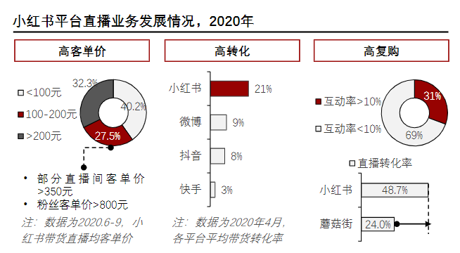 但也有业内人士表示,虽然电商基础羸弱,带货式直播业务交易也仅占营收的10%,但小红书的优势在于高转换率、高客单价以及高复购率。