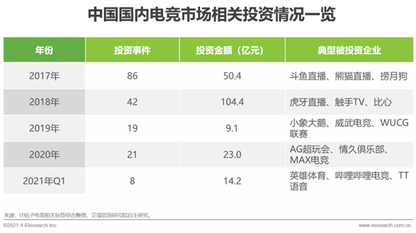 与此同时,相关投资的热度也在持续攀升。2017年、2018年达到投资高峰,游戏直播和电竞陪练等成为这两年的热门投资标的。