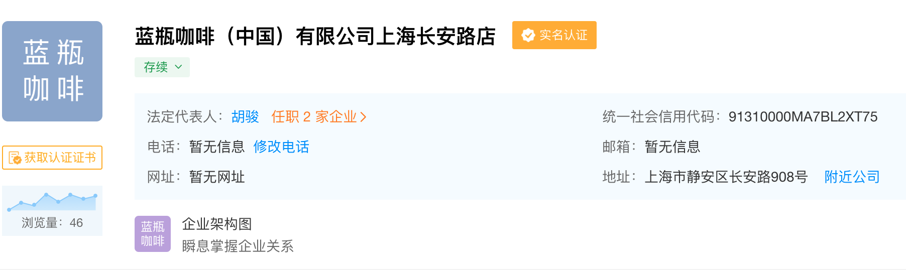 根据天眼查APP显示,蓝瓶咖啡于11月5日正式注册了上海分公司,公司名称为蓝瓶咖啡(中国)有限公司上海长安路店,注册地址为上海市静安区长安路908号。