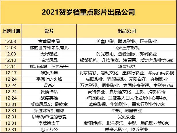 仅看贺岁档重点影片的出品公司阵营,不难发现各家对贺岁档寄予的厚望。