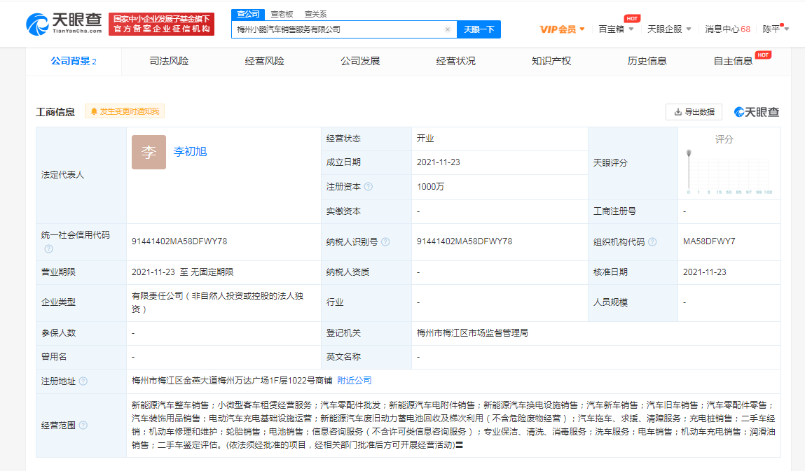 天眼查APP显示,11月23日,梅州小鹏汽车销售服务有限公司成立,法定代表人为李初旭,注册资本1000万人民币,经营范围包括新能源汽车整车销售、小微型客车租赁经营服务、新能源汽车换电设施销售、汽车新旧车销售等。股东信息显示,该公司由小鹏汽车销售有限公司全资控股。