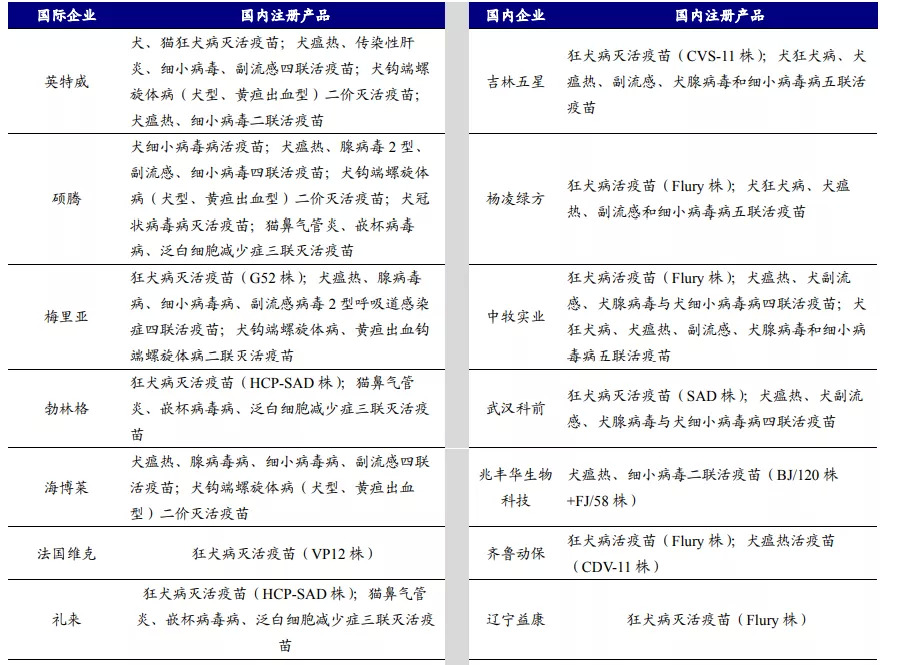从产品品类看,国产厂商产品质量及品类较进口厂商均有较大差距,国内大多数厂商仅获批狂犬病疫苗,猫犬联苗品类较少,尤其是猫类疫苗产品暂无国产厂商注册。