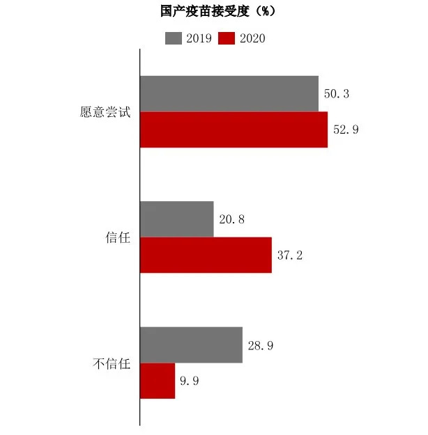 以《2020年中国宠物行业白皮书》中的数据为例,2020年约52.9%的宠主愿意尝试国产疫苗,较2019年上升了2.6%;约37.2%的宠主信任国产疫苗,较2019年上升16.4%。
