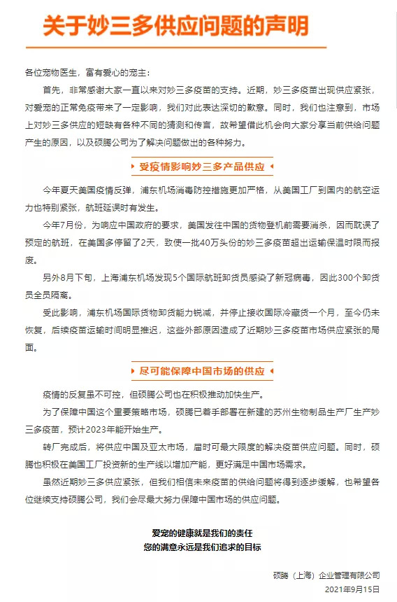 2021年9月,硕腾公司的一份公开声明引发了国内宠物疫苗市场的震荡。公开声明显示: