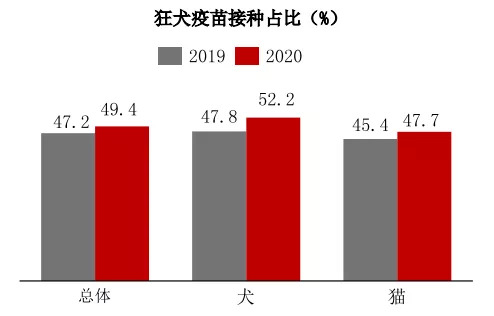 2020年,我国兽用狂犬疫苗的接种率约49.4%,较2019年上升2.2%。按照发达国家已大范围接种兽用狂犬病疫苗消除狂犬病的成功经验,我国兽用狂犬病疫苗的渗透率仍有进一步提升的空间。