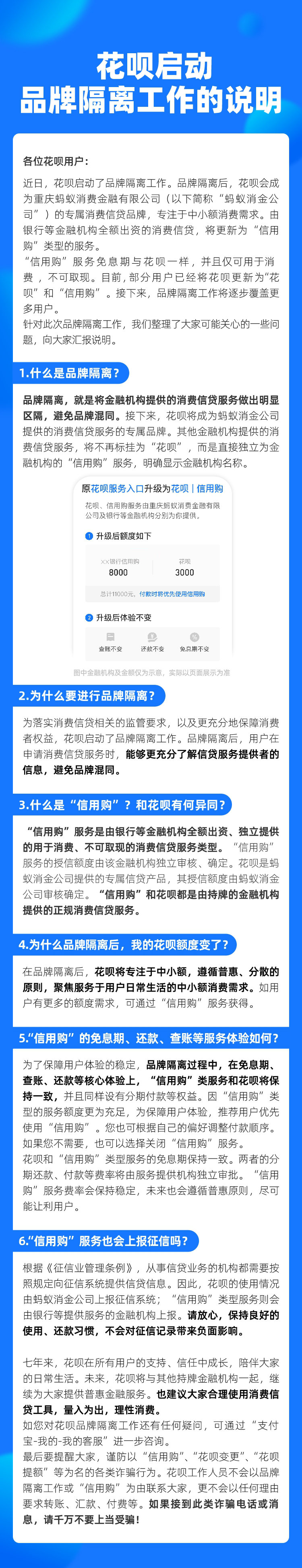 @花呗 微博11月24日消息,花呗宣布启动品牌隔离,为落实消费信贷相关的监管要求,花呗将成为重庆蚂蚁消费金融有限公司的专属消费信贷品牌,并专注于中小额贷款。由银行等金融机构全额出资的消费信贷,将更新为“信用购”类型的服务。“信用购”服务免息期与花呗一样,且仅可用作消费,不可取现。