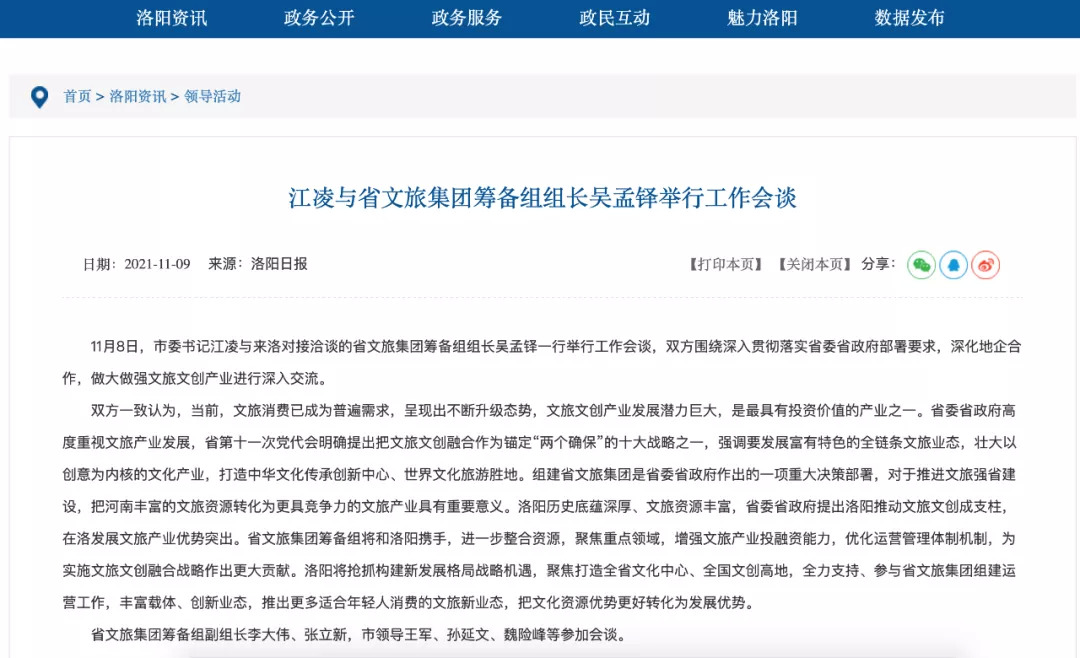 依照《洛阳日报》报道,11月8日,洛阳市委书记与河南省文旅集团筹备组组长吴孟铎举行工作会谈,其所交流内容,有多个要点:
