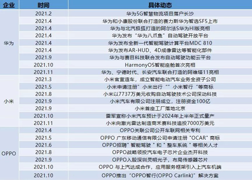 进入2021年,跨界造车企业开始激增,包括百度、阿里、腾讯等互联网公司和华为、小米、OPPO等通信科技企业,都在争相布局智能汽车领域,行业竞争步入“战国时代”。
