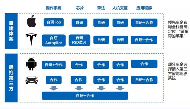 在新的竞争态势下,智能汽车正遵循着与智能手机相似的发展路径,逐步从扩张期走向分化期。一方面,新能源汽车继续保持高速逆势增长,逐步实现对传统燃油车的替代效应。今年1-10月,新能源汽车累计零售213.9万辆,同比增长191.9%,市场渗透率达到13%,较2020年的5.8%提升2.2倍。另一方面,车企基于自身发展现状及对自动驾驶的不同预期,发展路线开始呈现出分化迹象,正在形成类苹果的“自建体系”与类安卓的“拥抱第三方”两大阵营。