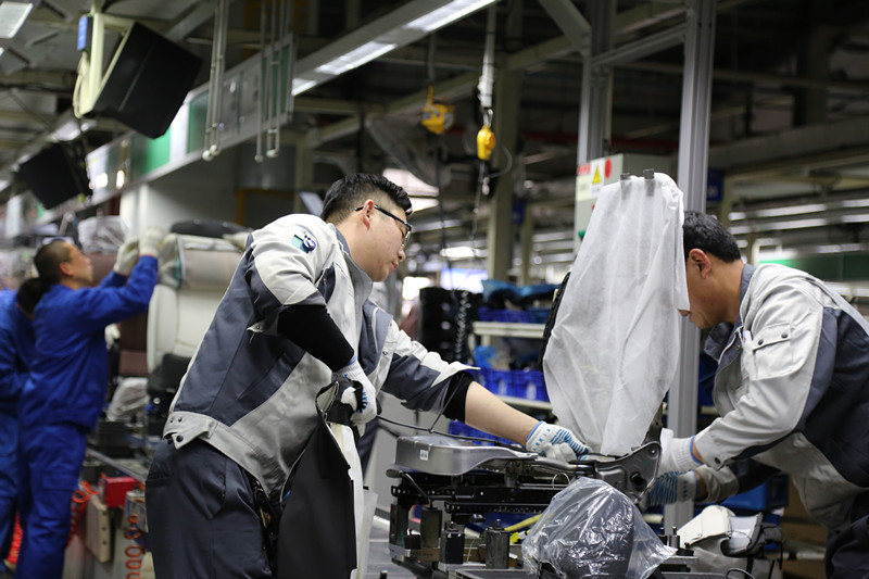 探访福山区,在延锋安道拓(烟台)座椅有限公司总装车间,工人将座椅总装装配完之后,随着发运车运到上汽通用东岳汽车有限公司进行整车装配。