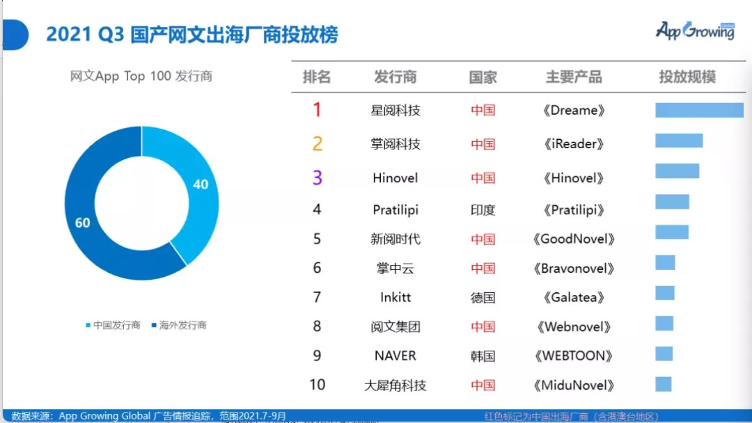 看来中国公司牢牢占据了美国网文界的主导权。只不过硬糖君从今年Q3海外网文广告投放榜来看,德国的Inkitt、韩国的NAVER、印度的Pratilipi都在加大投放力度,后来者来势汹汹、不容小觑。