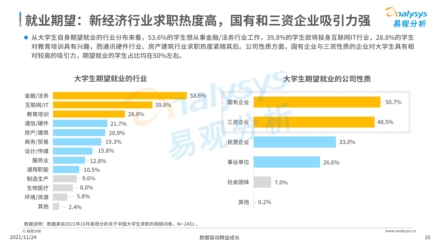 11月25日,易观分析发布《2021年中国大学生招聘求职洞察》,针对大学生的求职行为的调研显示,新经济行业求职热度高。