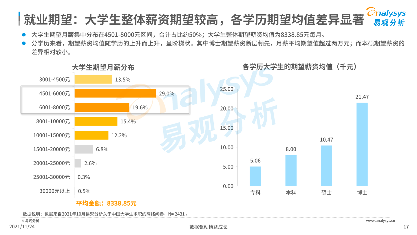 大学生期望月薪分布在4501-8000元间,合计占比约50%;大学生整体期望薪资均值为8338.85元/月。博士平均月薪期望值超过2万元。