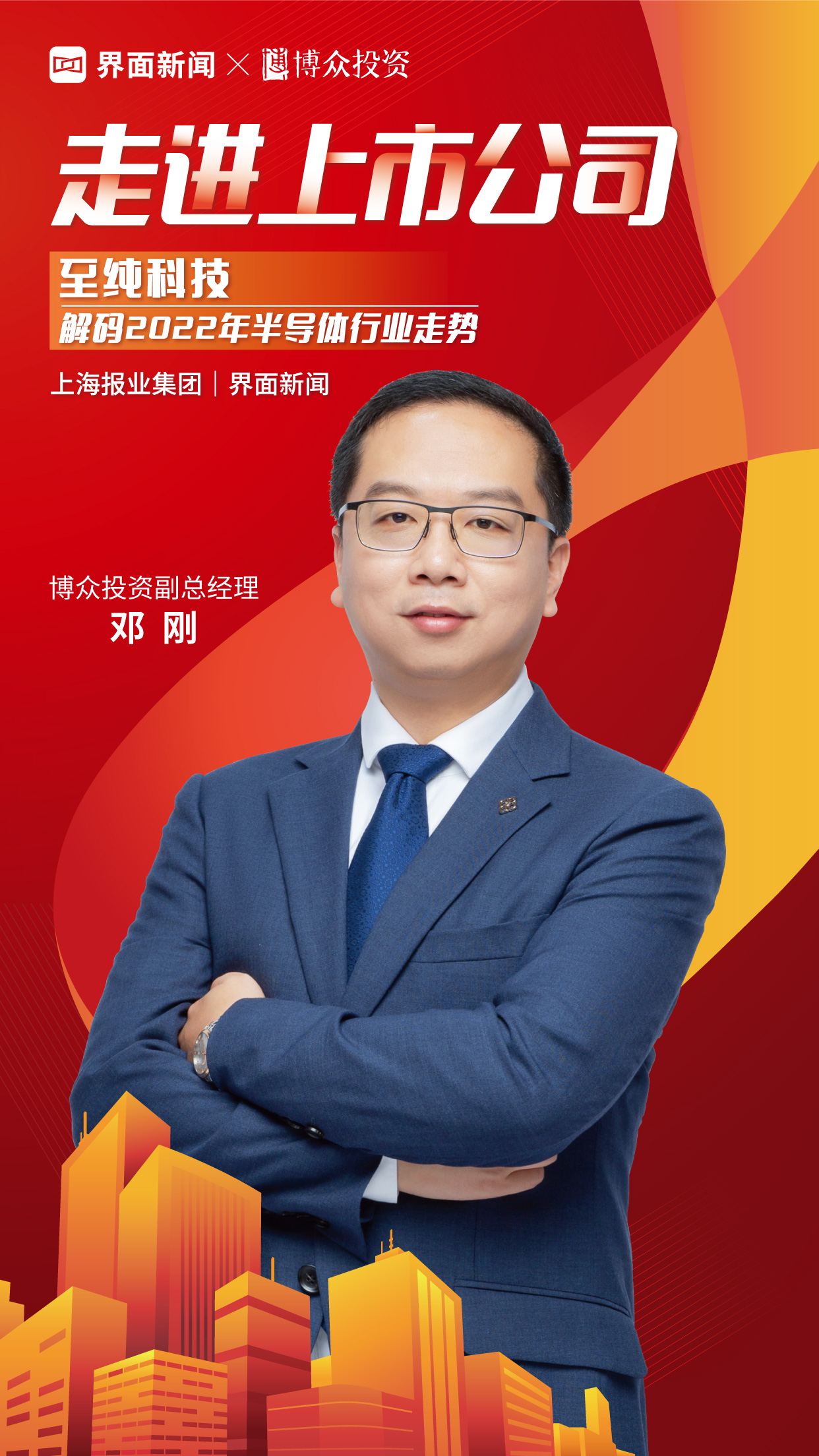 由上海报业集团 | 界面新闻开展的【走进上市公司】专题活动将于本月启动。作为中国最具有影响力的原创财经新媒体,界面新闻一直关注中国资本市场的发展,对于作为资本市场基石的上市公司更予以高度重视。第一期【走进上市公司】界面新闻将携手联合主办方——广东博众证券投资咨询有限公司(以下简称“博众投资“),一同走进国内高纯工艺系统及半导体湿法清洗设备的行业杰出企业——上海至纯洁净系统科技股份有限公司(以下简称“至纯科技“)。以“解码2022年半导体行业走势”为主题,特邀企业高管、投资分析师等,通过企业分享及深度对谈等形式,积极展现上市公司风采,分享专业投顾建议,共探发展新机遇。