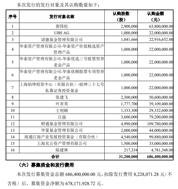 海星股份11月25日晚间公告,公布公司2020年度非公开发行A股股票发行情况报告书,本次发行股票数量为3120万股,均为现金认购,发行价格为22.00元/股,募集资金总额为6.864亿元。本次发行最终获配发行对象共计16名。