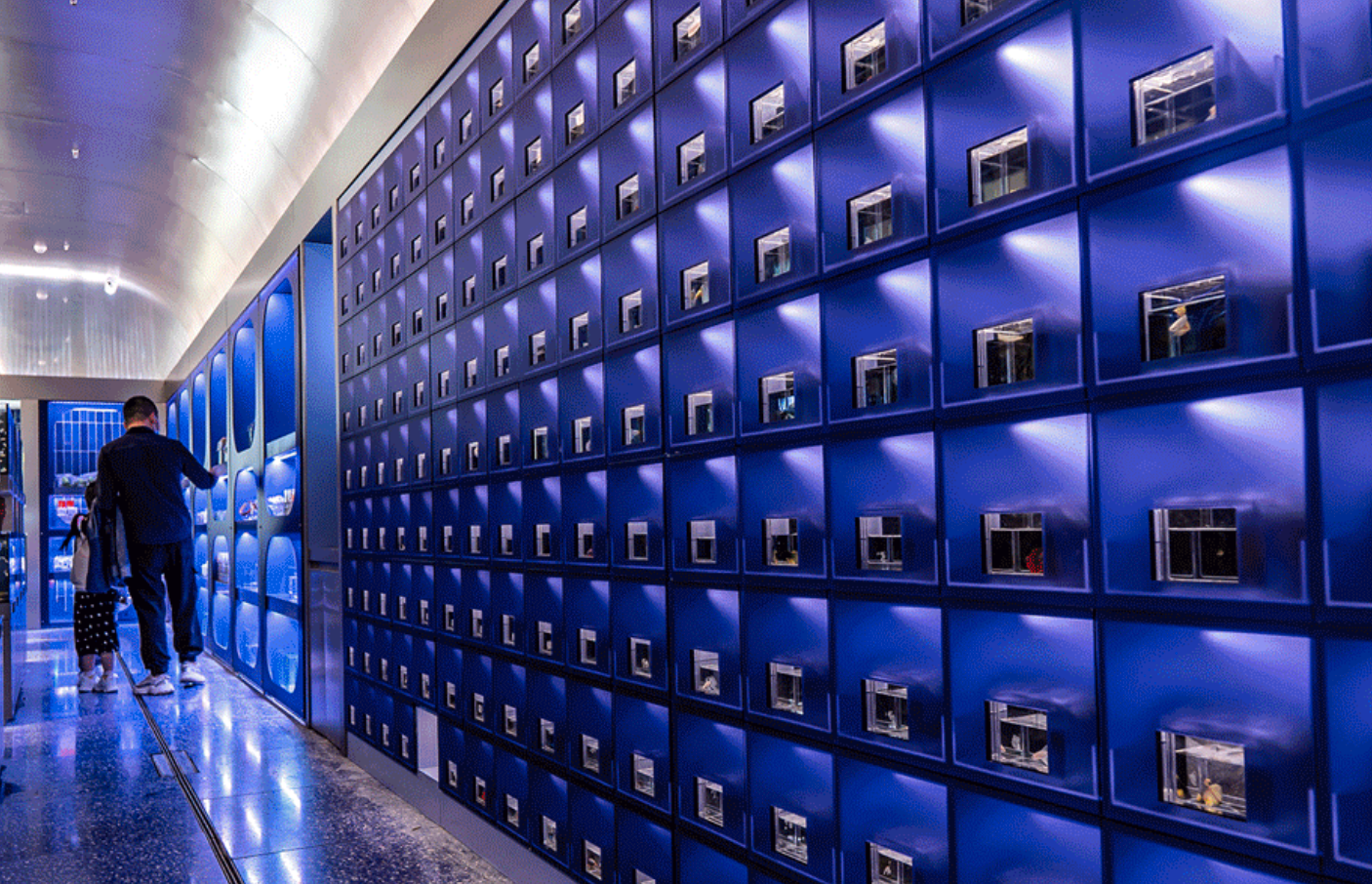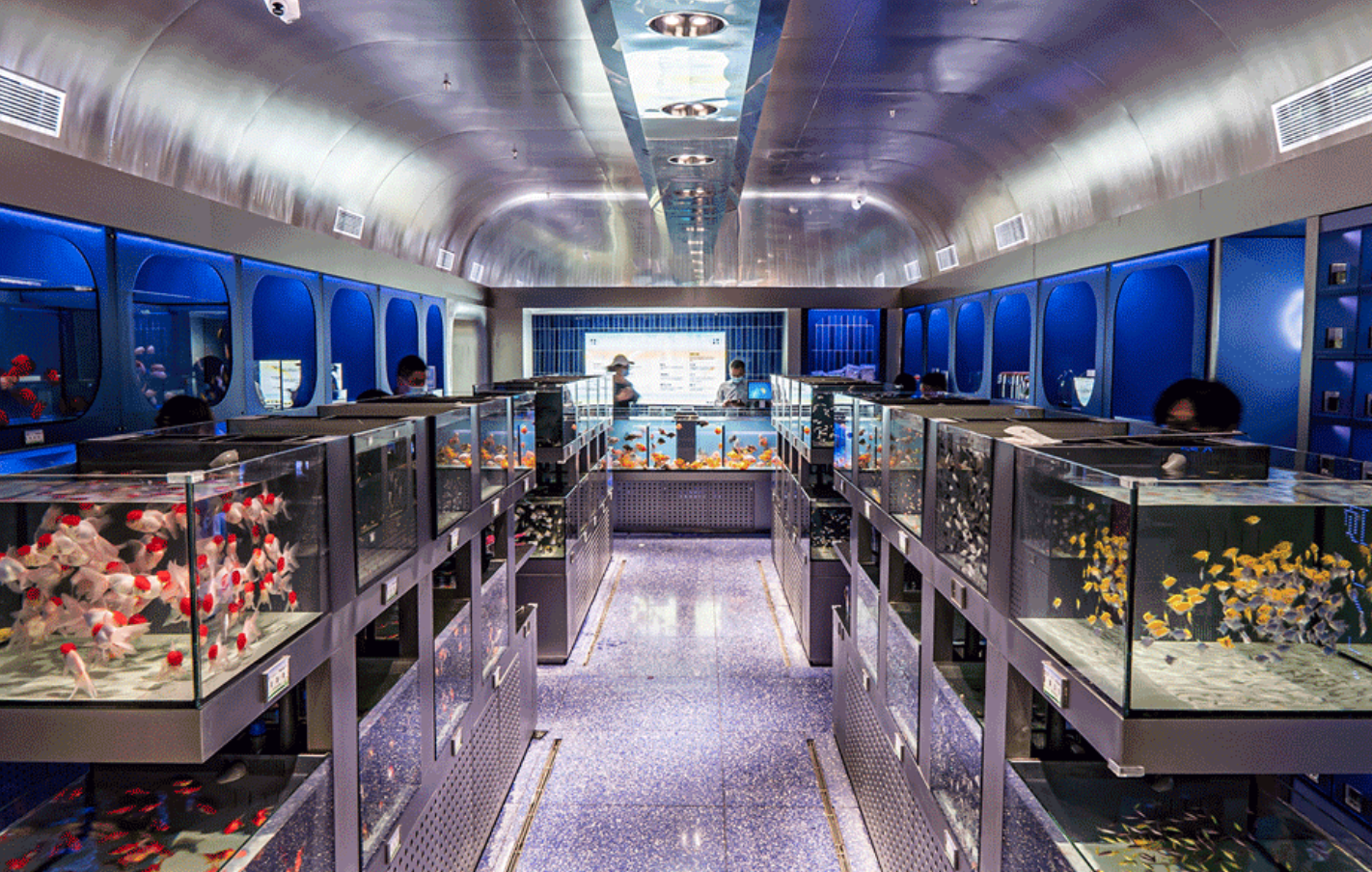 绿色、银色和白色为主色调的空间设计,让门店看上去明亮、干净且友好;鱼池按不同品种进行细分,但没有水草、假山等传统造景,更像是放在太空舱、基因库里;荧光灯和水纹灯的照射,则满足了年轻人出片时对光线的要求。