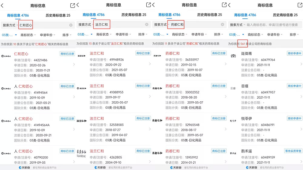 根据天眼查,各大电商平台泛滥的“仁和匠心”、“法兰仁和”和“药都仁和”商标均为仁和集团所有,与上市公司仁和药业没有直接关系。值得注意的是,仅“日化用品”这一类别,仁和集团就有561条商标信息。