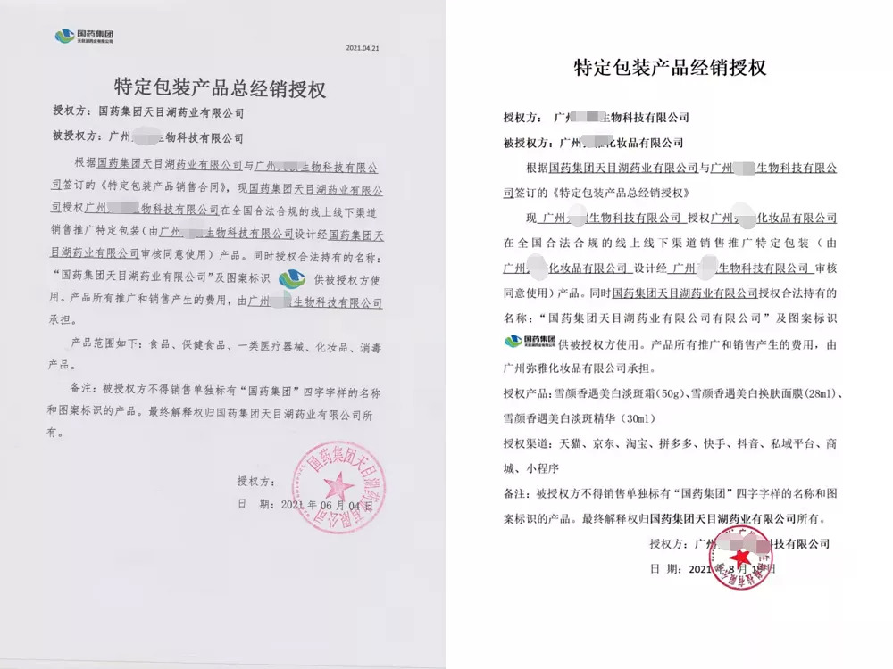 记者在某电商平台上联系到“某化妆品超级工厂”,该店铺所售卖的商品涉及到仁和、国药、修正、南京同仁堂的商标。在问及某款洁面产品与国药集团之间的关系时,该店铺客服声称:“国药集团授权我们生产销售。”为证明“资料齐全”,客服甚至还提供了国药集团图案标识的授权证明。授权证明显示,国药集团天目湖药业有限公司授权广州某生物科技有限公司,该公司又授权给广州某化妆品有限公司。