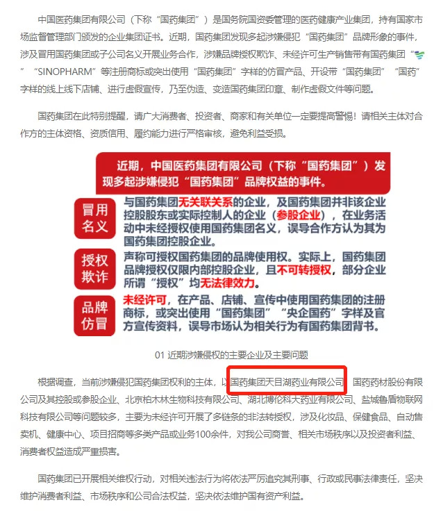 值得注意的是,记者还从国药集团官网获悉,频繁涉嫌冒用国药集团名义同各地政府或企业开展交流合作的公司“国药集团天目湖药业有限公司”和“国药药材股份有限公司”,曾经是国药集团旗下控股企业,但经过股权结构变化,目前已不再是国药集团旗下控股企业,其是独立的市场主体,独立承担相关法律责任。