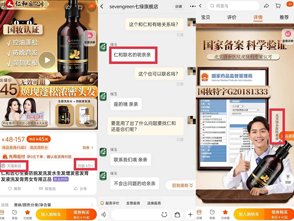 记者在天猫平台搜索“仁和”,销量比较高的化妆品是“博倩姜汁防脱育发洗发液”,月销高达4W+。在产品的包装上,赫然印着“仁和匠心”这一商标。值得注意的是,在记者问到这款产品与仁和有什么关系时,店铺客服答曰:“仁和联名”。