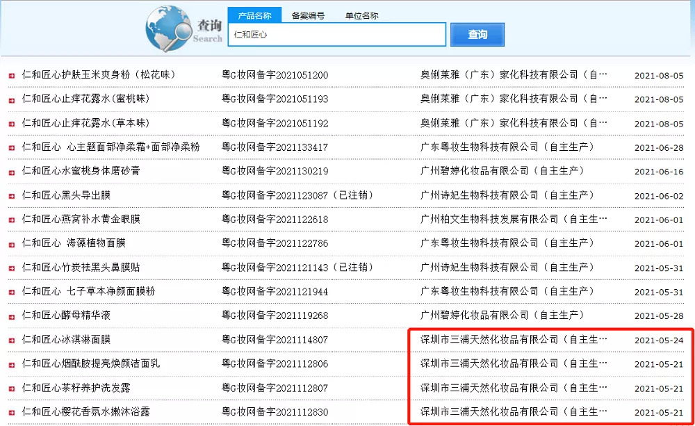 为溯源这些所谓的“仁和”化妆品,记者在国产非特殊化妆品备案平台检索“仁和匠心”,发现近600条备案信息,但其中竟没有一款产品是由仁和集团注册或生产。根据备案信息,可以确定的是,产品或为代工企业自主生产,或为这些代工企业委托其他化妆品企业进行代工生产。据不完全统计,仅2021年1月至8月,备案“仁和匠心”非特殊化妆品的企业就有近20个。