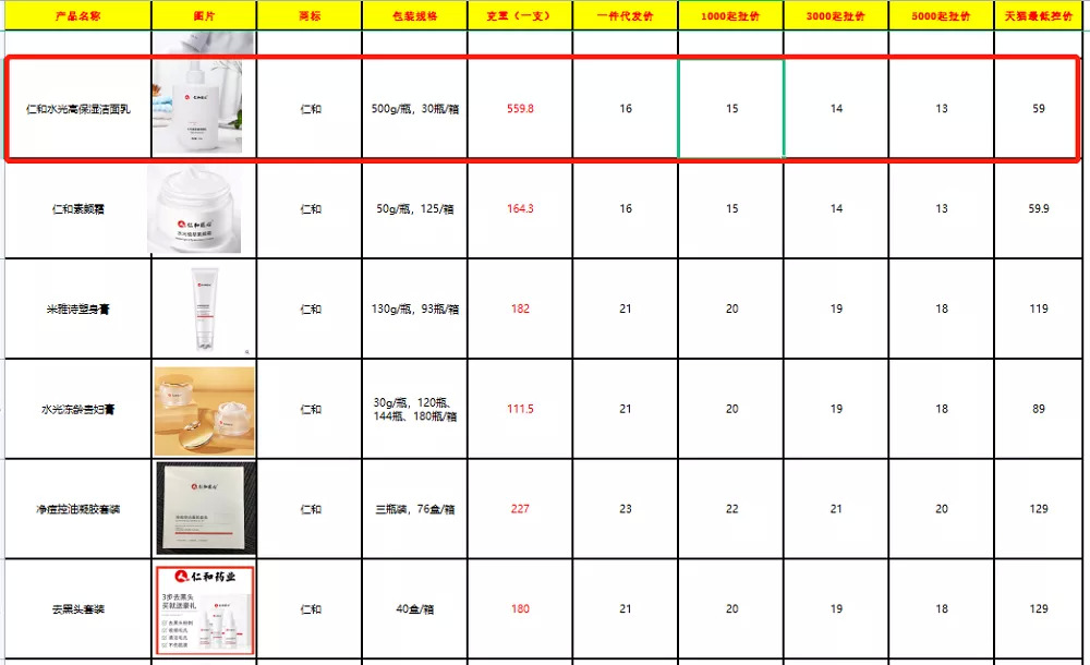 报价单里,这些产品的价格低得令人震惊,却还定了所谓的控价。以在天猫平台上热销的“仁和同款洗面奶”为例,该产品的一件代发价为16元,1000件起批价为15元,3000件起批价为14元,5000件起批价为13元,而天猫最低控价却高达59元。