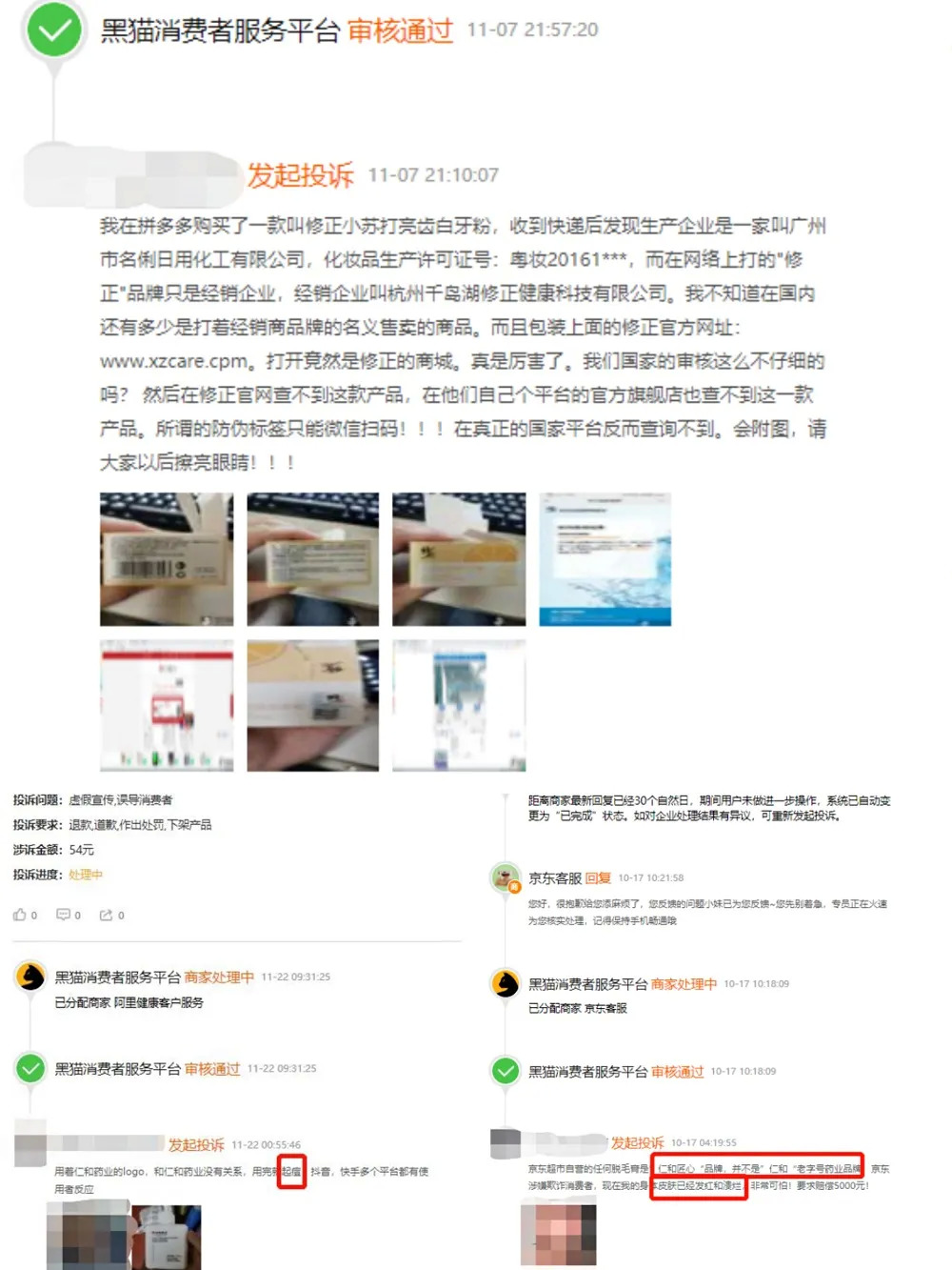 以“仁和匠心”和“药都仁和”为关键词,记者在黑猫平台上均能找到投诉记录。其中,既有投诉因使用产品无效甚至对皮肤造成伤害的,也有投诉产品虚假宣传、贴牌生产的。