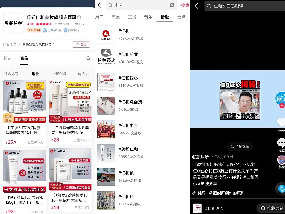 此外,在抖音平台与“仁和”相关的话题播放量叠加起来已经破4亿次,但话题相关内容几乎都是与化妆品相关。记者注意到,除了大面积的推广与“卖惨”视频之外,“仁和”化妆品也成了多位美妆博主吐槽的对象。