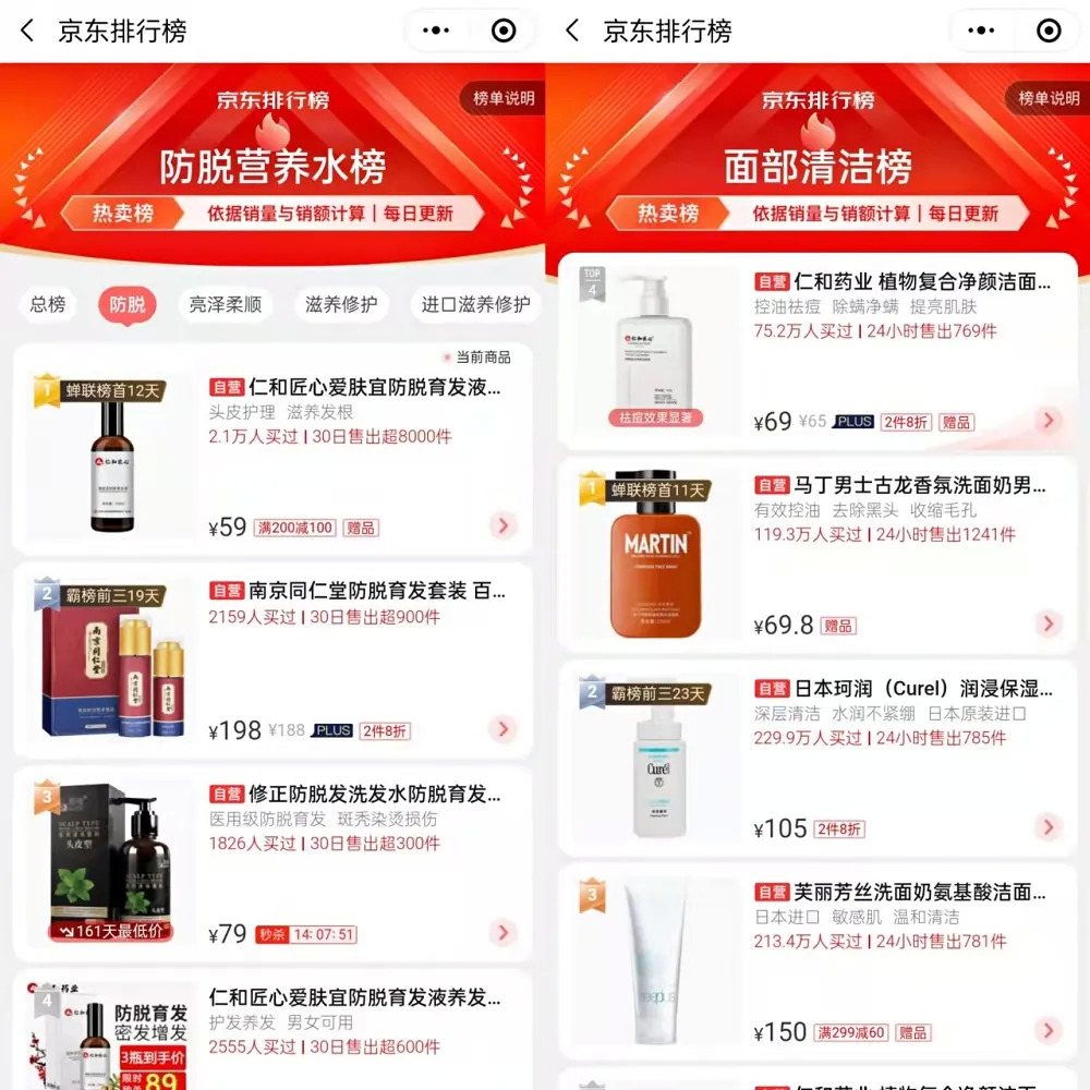 在京东平台,“仁和”化妆品也是当之无愧的大爆款。在京东排行榜防脱营养水热卖榜,贴着“仁和”商标的“爱肤宜防脱育发液”不仅占据了榜首,贴着“仁和“商标的产品也“霸占”了前十中的其他3席。在面部清洁热卖榜中,“人仁和匠心植物复合净颜洁面乳”也高居榜四,连一众国际品牌都屈居其后。
