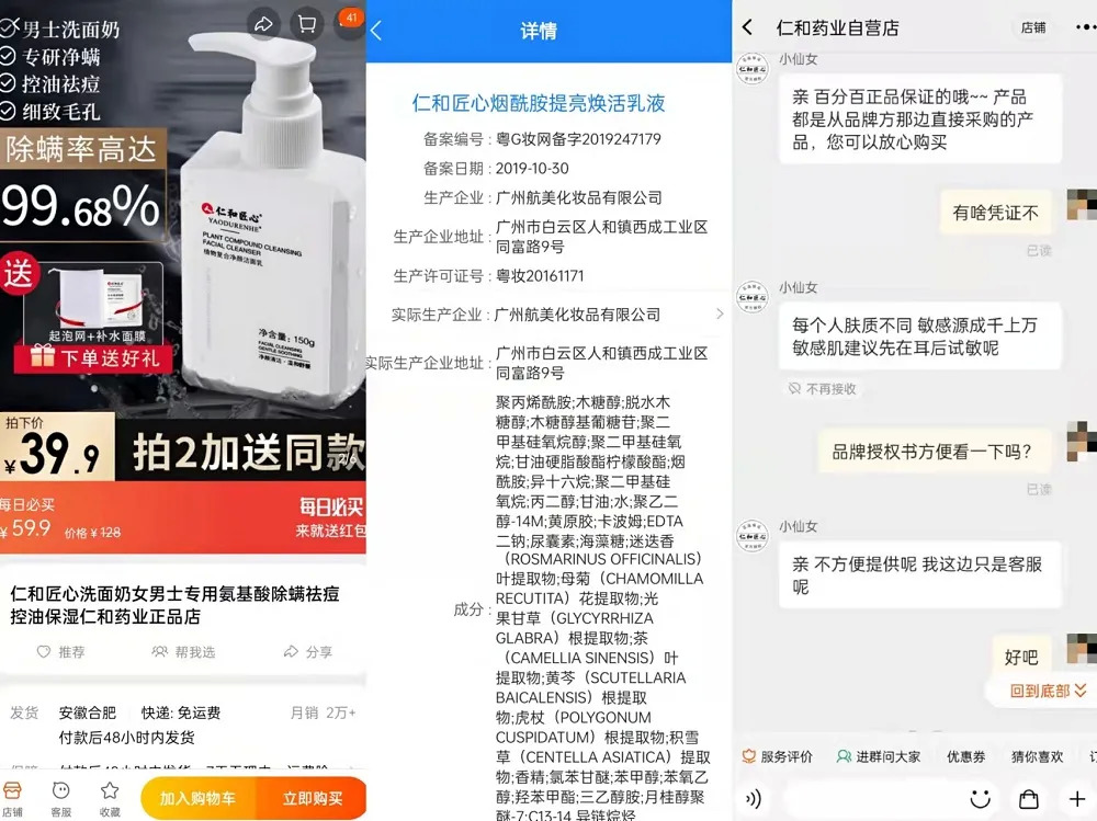 搜索结果显示,另一款较畅销的产品为“仁和匠心洗面奶”,月销量超2W。但是记者通过查询备案信息,发现“粤G妆网备字2019247179”实际的关联产品为“仁和匠心烟酰胺提亮焕活乳液”。另外令人生疑的是,当记者提出想要查看仁和匠心品牌给“仁和药业自营店”的品牌授权书时,客服表示:“不方便提供”。